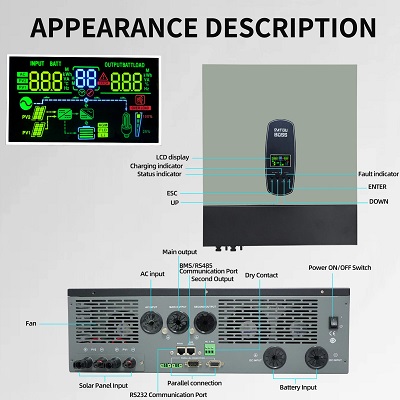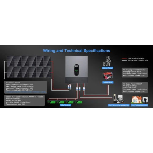 • Висока изходна мощност: 11KW 48V DC към 230V AC хибриден инвертор с чиста синусоида.