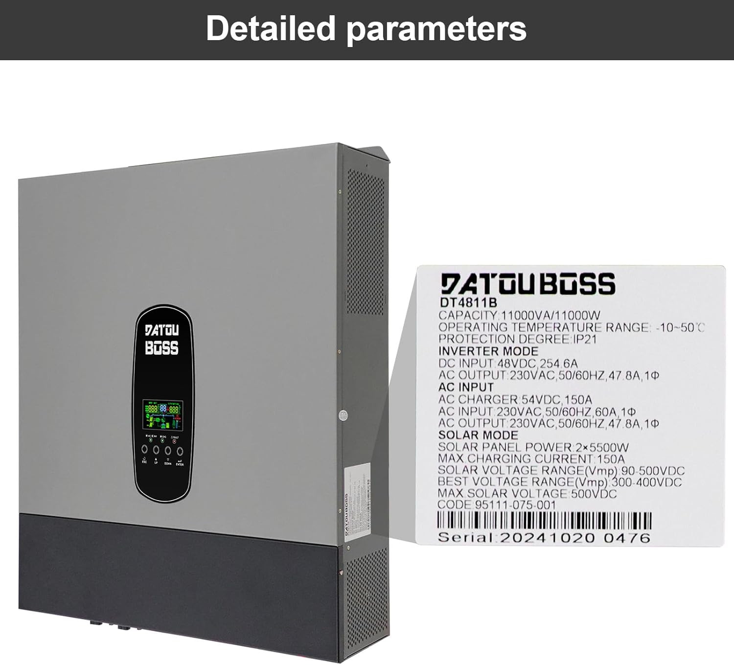 Хибридният инвертор DATOUBOSS 11KW поддържа паралелна работа на до 9 устройства, за да увеличи общия капацитет на мощността. Тази функция позволява мащабируеми енергийни решения, съобразени със специфичните нужди от енергия.