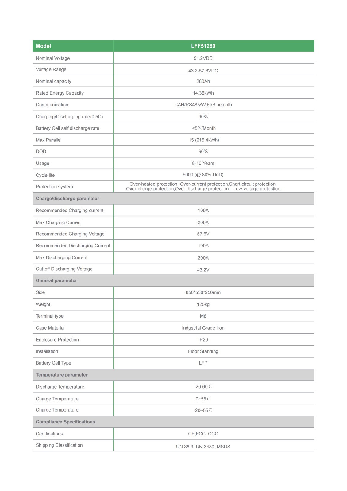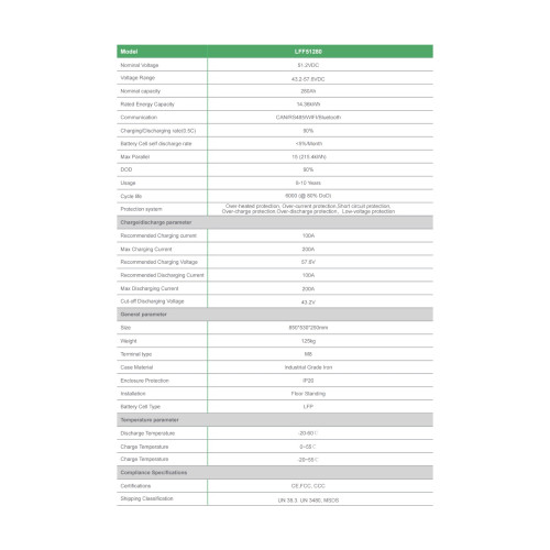 Батерията е направена от клетки Grade-A, литиево-железни фосфатни материали, вграден BMS, като могат да се свържат до 16 единици паралелно.